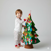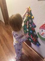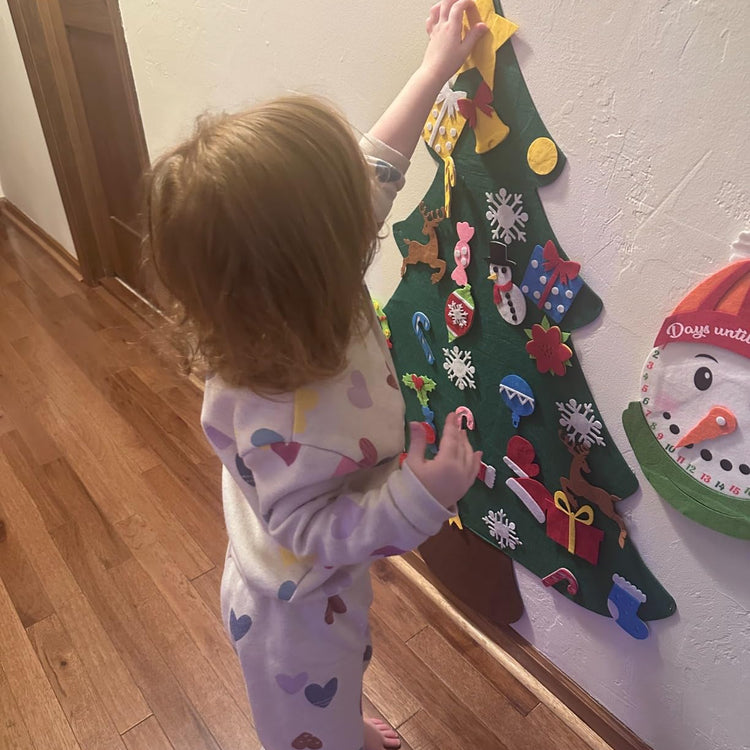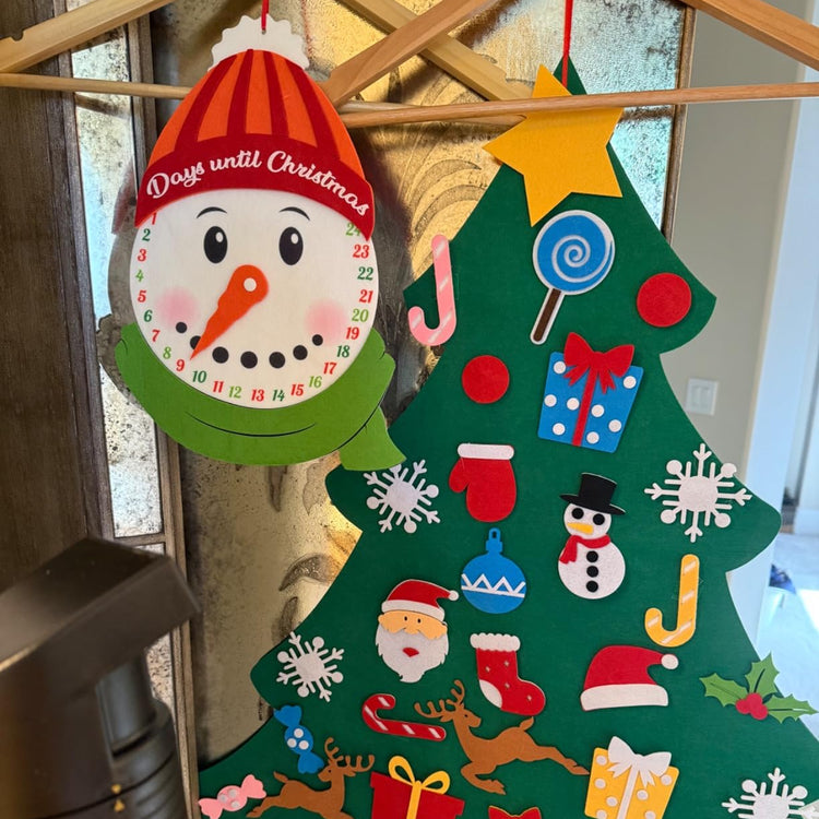 The felt Christmas tree measures approximately 37.5 inches tall by 27.5 inches wide, making it a perfect size for a wall display in a living room, child's room, or classroom.